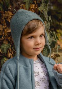 Căciulă din fleece pufos de lână merinos, dublată cu bumbac organic la interior.