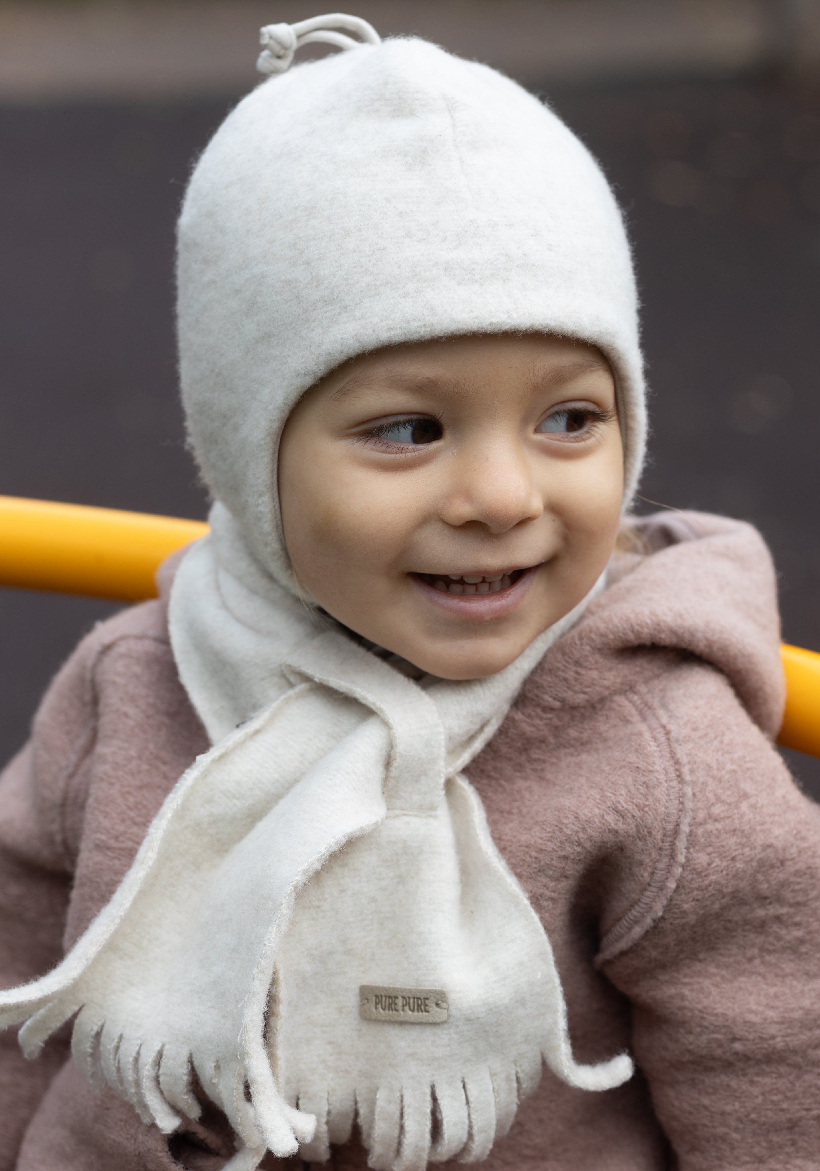Căciulă din fleece pufos de lână merinos, dublată cu bumbac organic la interior.