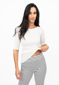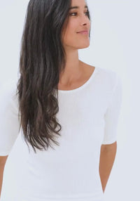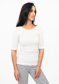 Bluză seamless, cu spatele decoltat și mânecă 3/4 din mătase și bumbac, foarte elastică și comodă, se așază perfect.