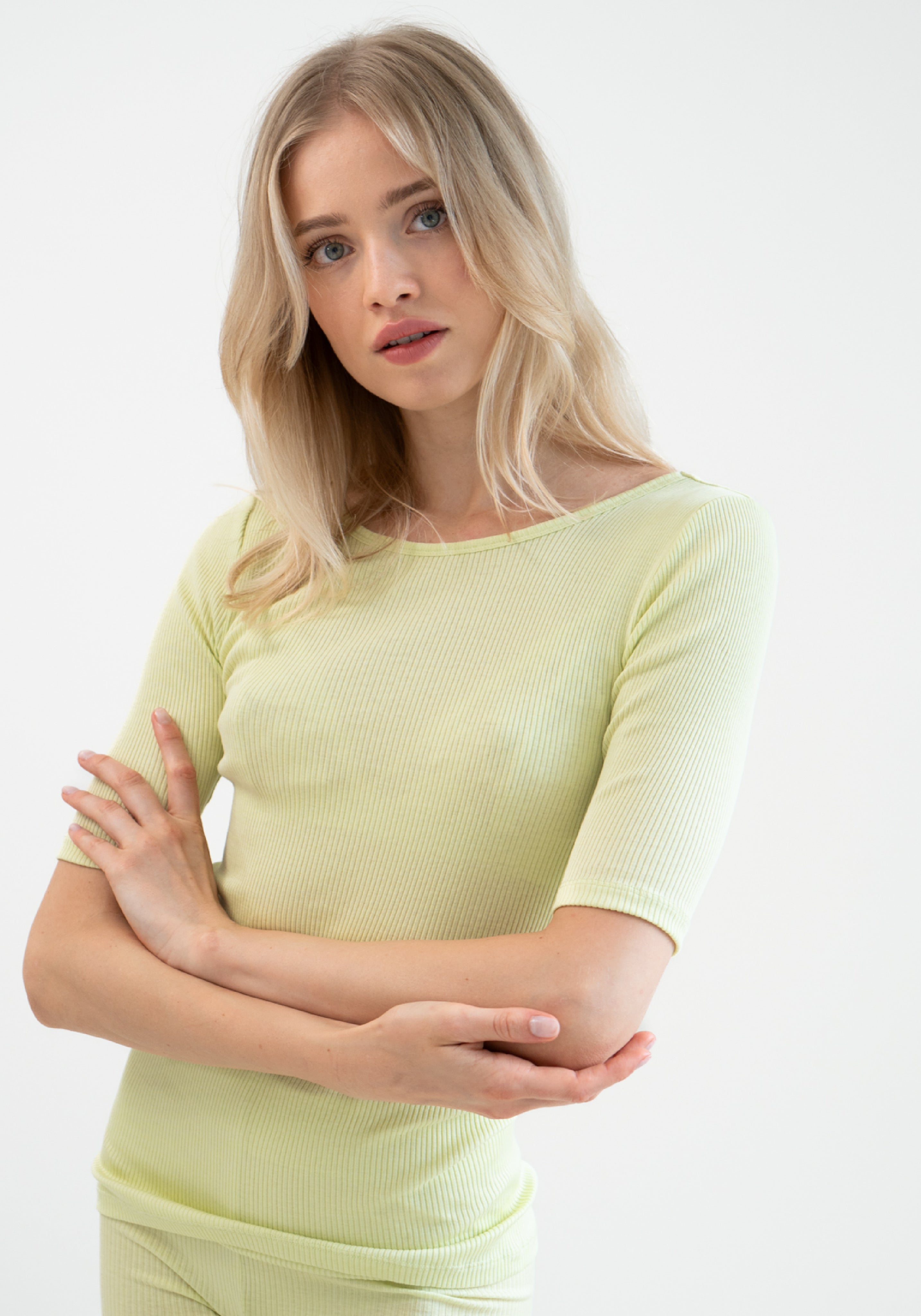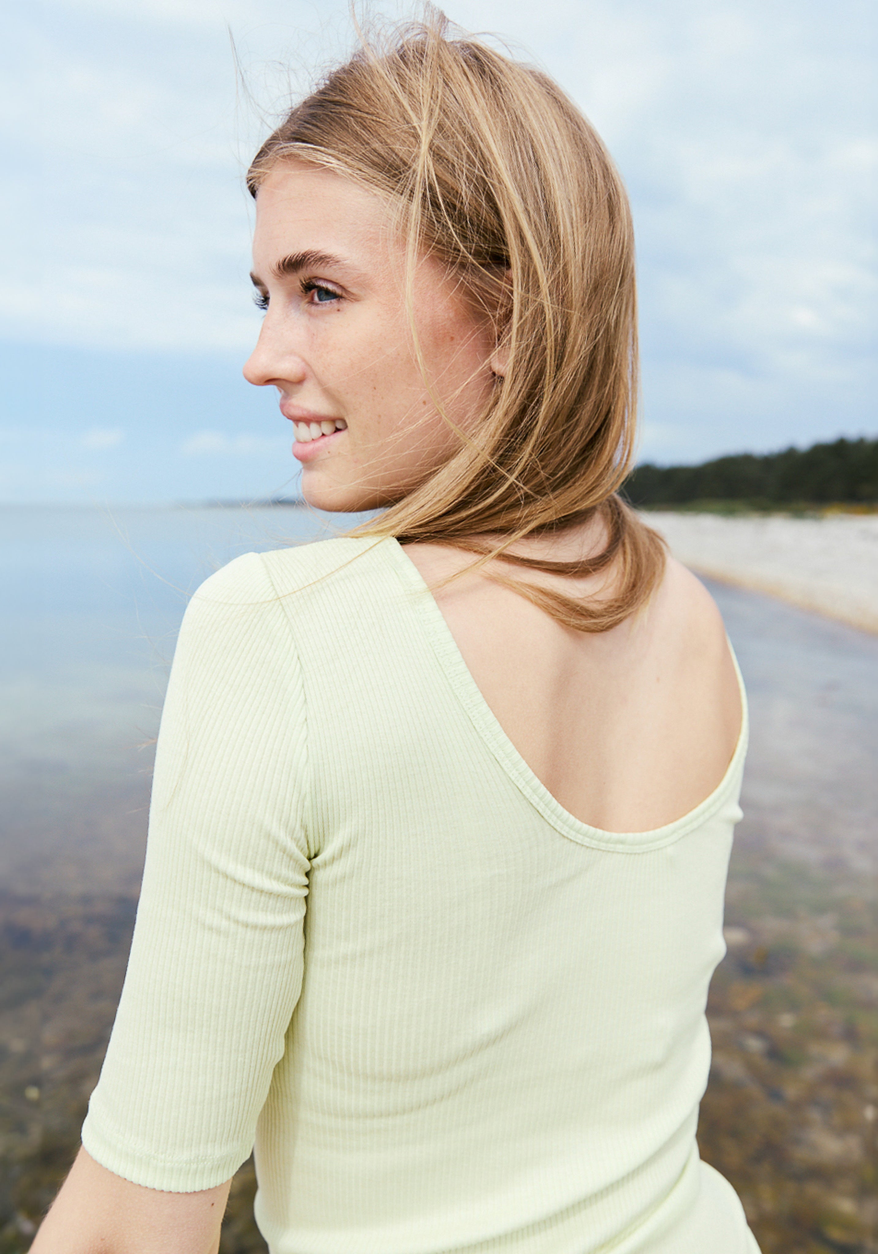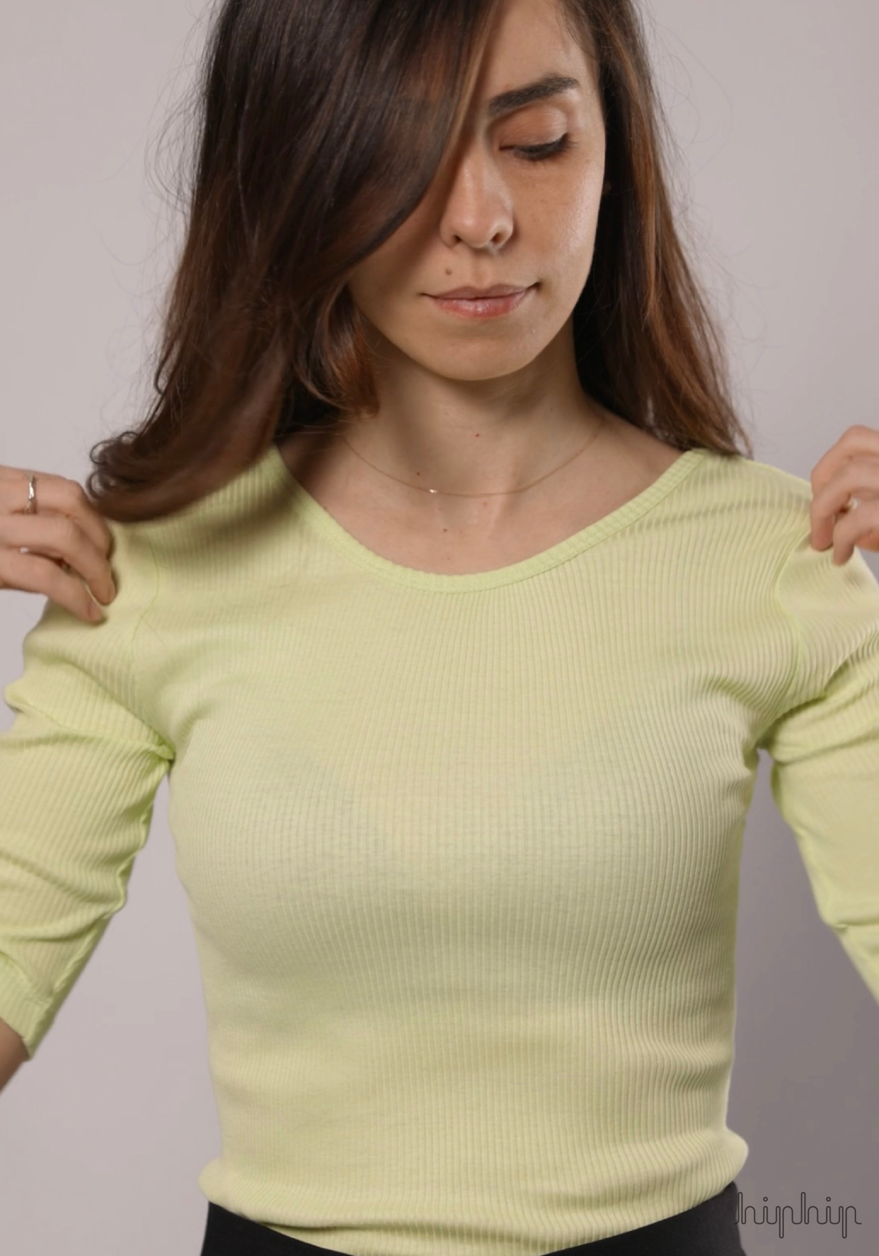 Bluză seamless, cu spatele decoltat și mânecă 3/4 din mătase și bumbac, foarte elastică și comodă, se așază perfect.
