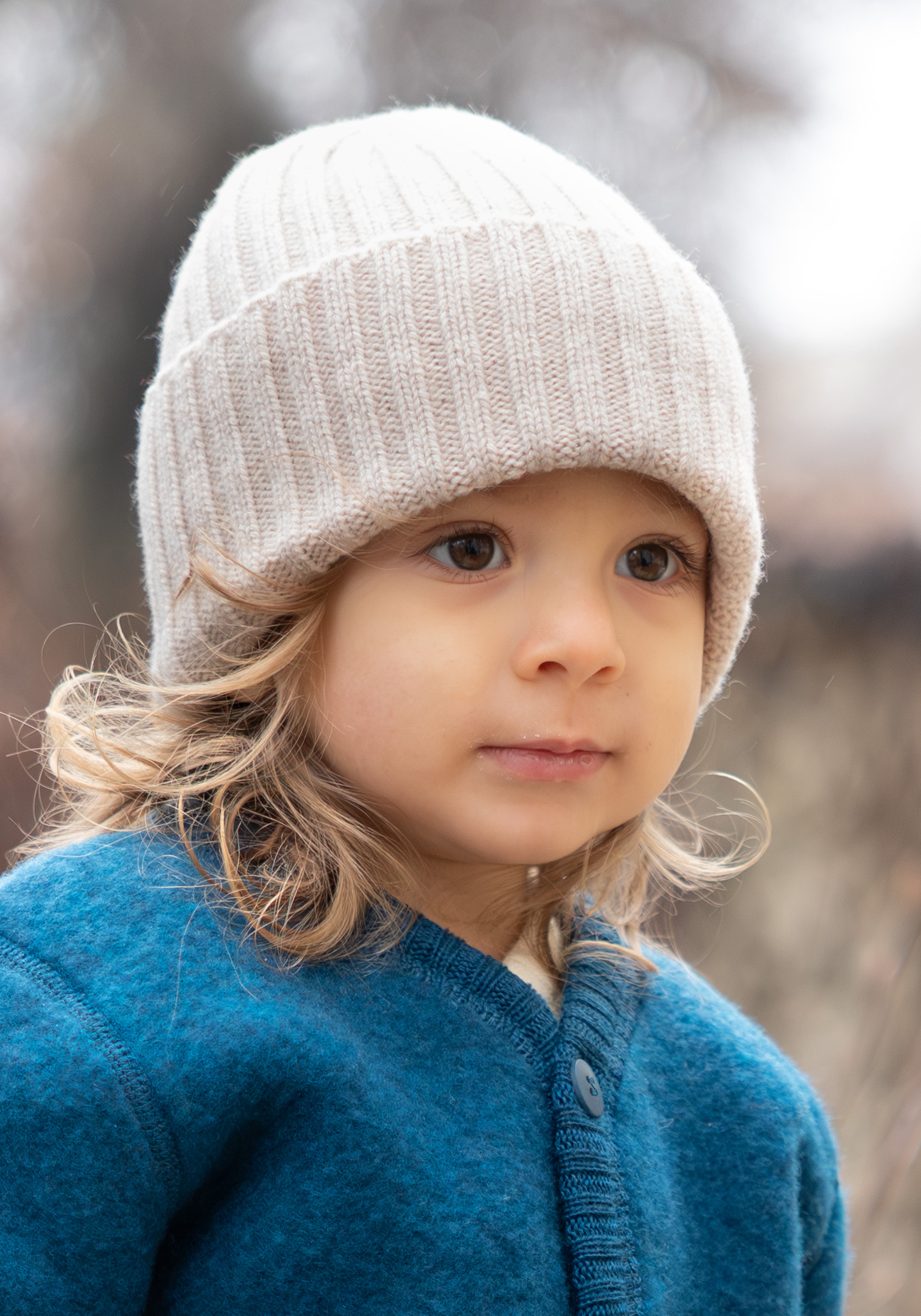 Căciulă din tricot rib, realizată dintr-un amestec premium de lână merinos și cașmir, extrem de moale și plăcut la purtare. Manșeta înaltă, răsfrântă, oferă un look modern și o potrivire confortabilă, ideală pentru zilele reci.