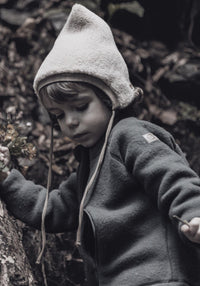 Căciulă pixie plușată din lână organică, dublată cu bumbac organic la interior.