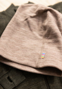 Caciulă dublată (beanie) care combină calitățile lânii merinos cu mătasea foarte fină, ideală pentru pielea sensibilă.