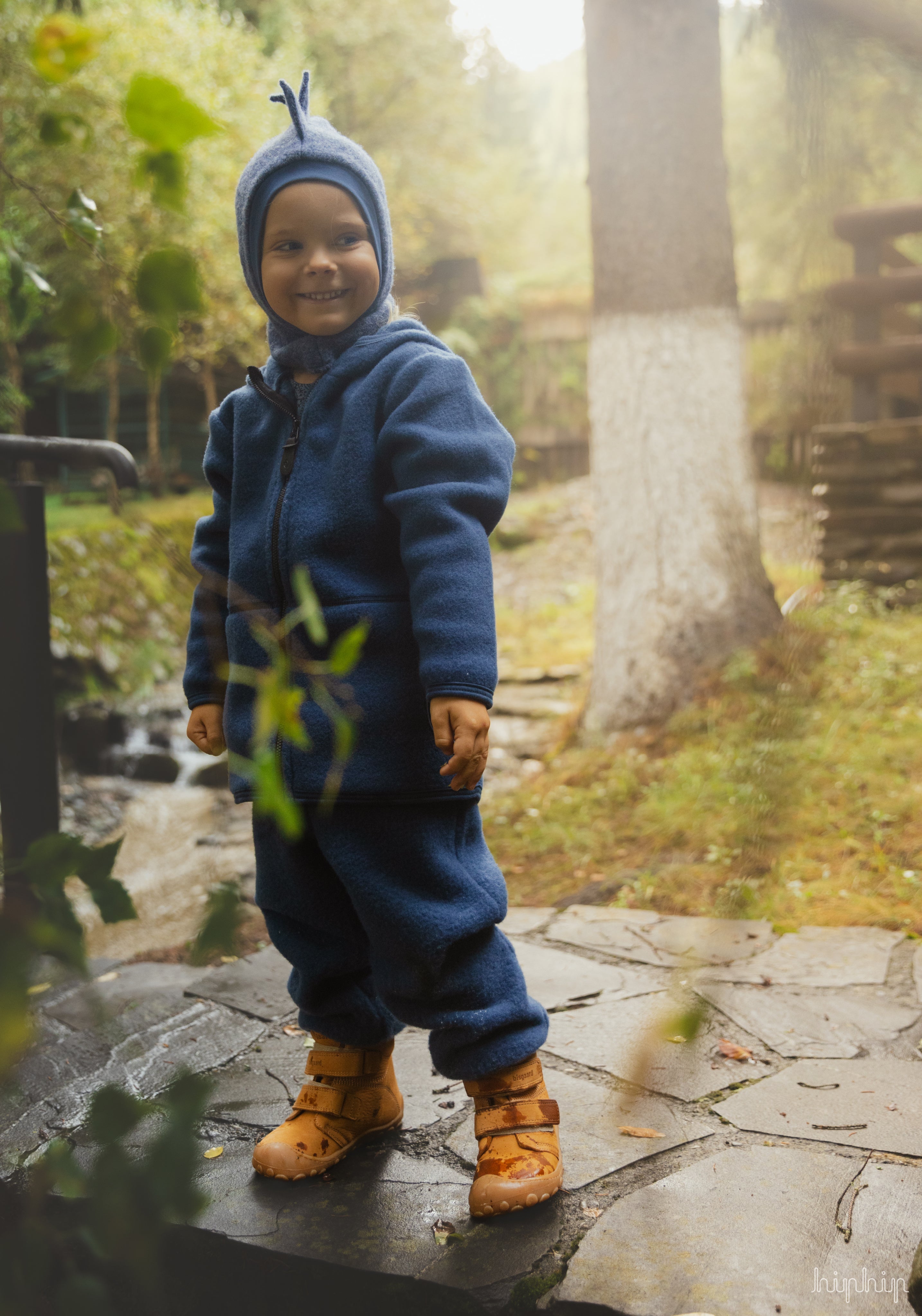 - exterior: 80% lână virgină organică, 20% bumbac organic; knit boiled wool
