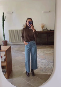 Pantaloni timeless denim din bumbac organic. Efectul vintage este dat de folosirea pietrelor ponce și nu prin folosirea agenților chimici.