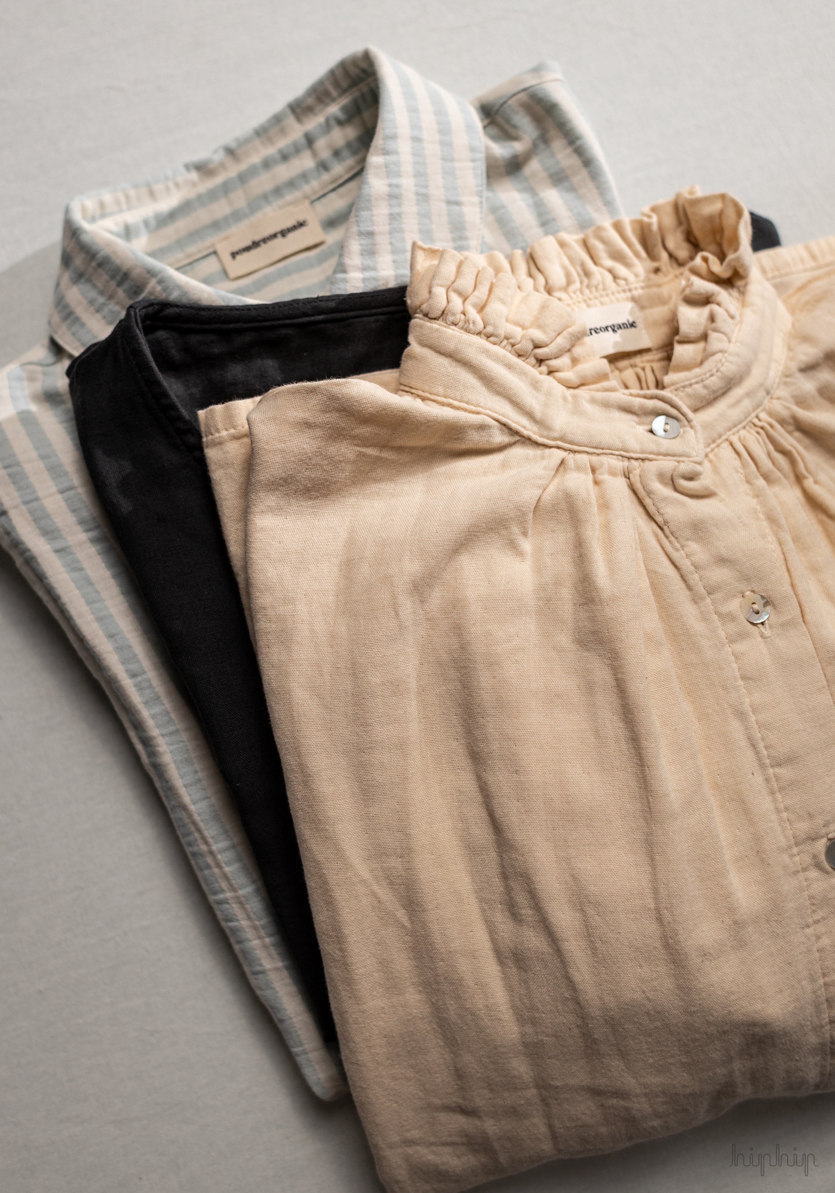 Când vine vorba de decizii ”de business”, Manon și Quentin țin cont în primul rând de impactul asupra mediului. Le vine ușor, pentru că și în viață personală sunt ghidați de principiul ăsta - consum local și rațional. Lucrează, în principal, cu bumbac cultivat organic în Turcia, certificat GOTS și OEKO-TEX, dar și cu in și materiale reciclate, prelucrate cu consum minim de energie.