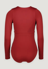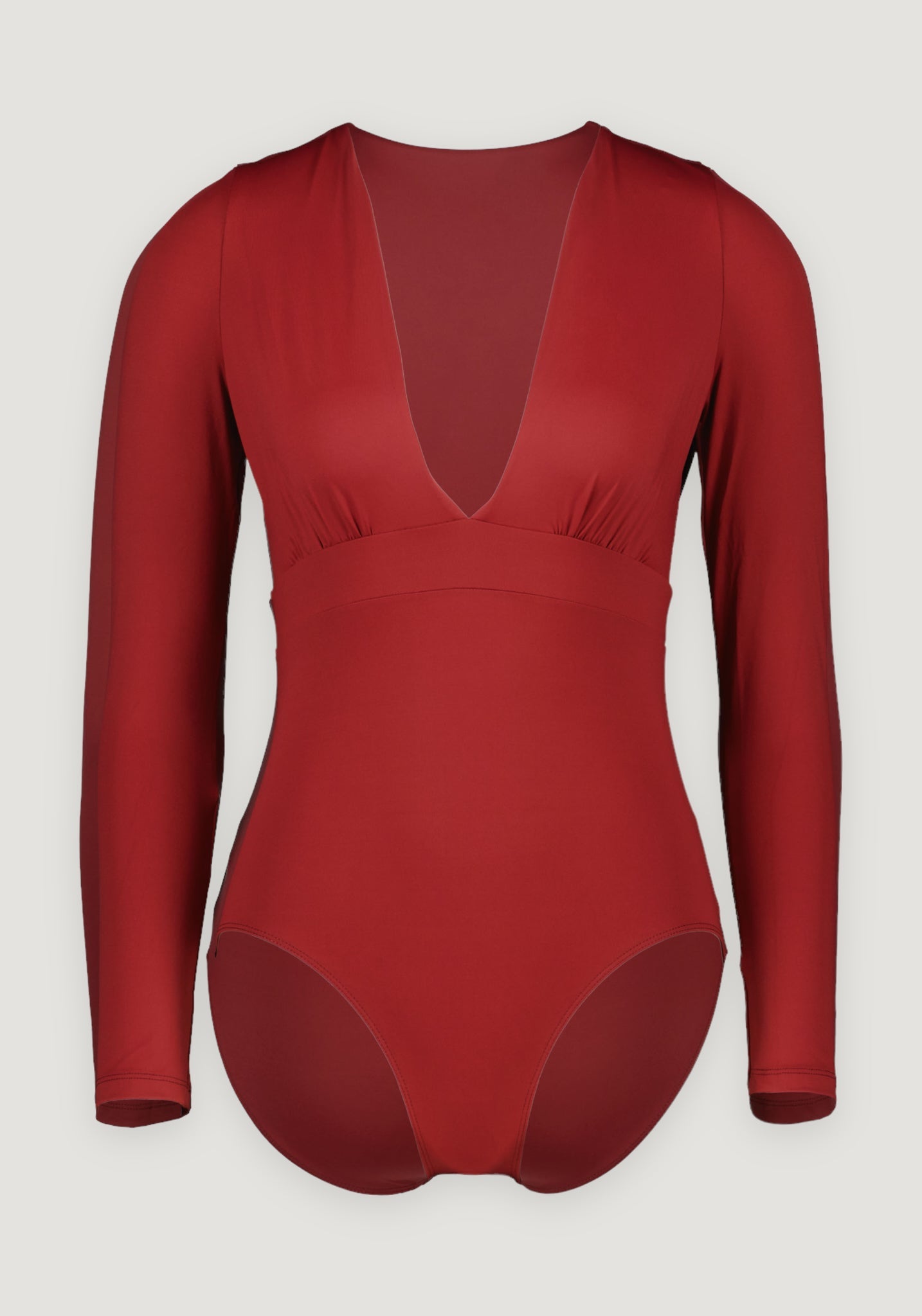 Costum de baie cu mânecă lungă cu protecție UV 50+, produs din fibre reciclate. Ladies, iubesc Canopea: design pe sufletul meu si impact redus asupra planetei. Chic, retro, curat si fabricat din plase de pescuit recuperate din oceane.
