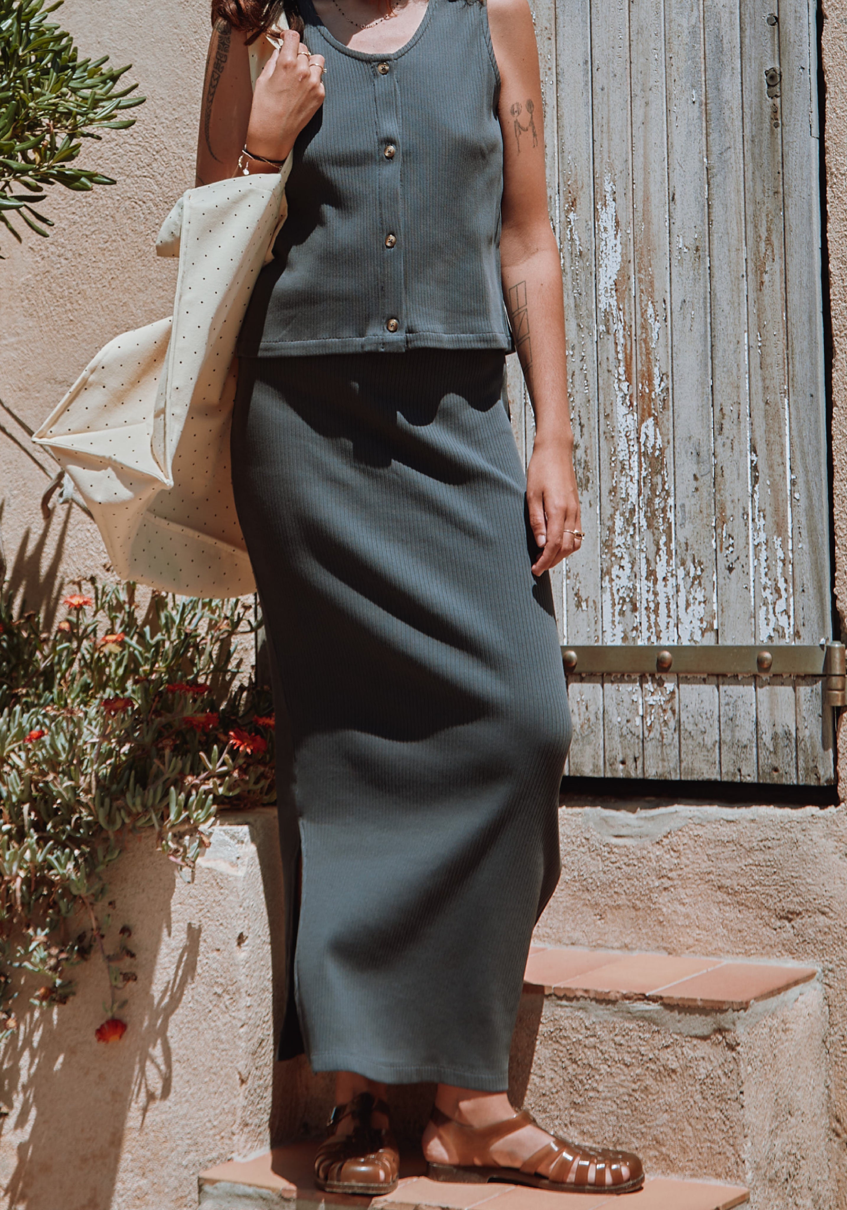 Fustă lungă din bumbac organic, cu efect de alungire a siluetei.