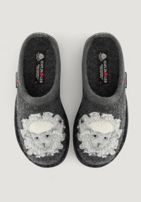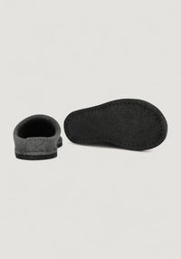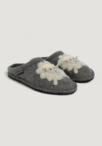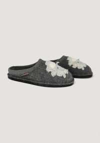 Papuci de casă călduroși și moi, cu model aplicat, realizați din lână fiartă și rezistentă.