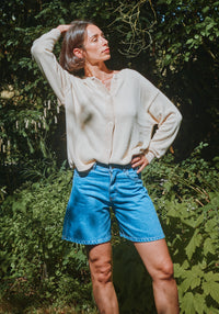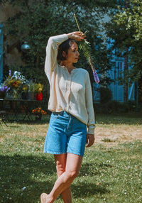 Pantaloni scurți din denim, bumbac organic, într-o nuanță calmă de albastru, perfecți pentru zilele calde în care vrei confort fără efort. Materialul este moale, respirabil și plăcut pe piele, iar croiala lejeră oferă libertate de mișcare și un look relaxat, natural. Se potrivesc ușor cu un tricou simplu, o cămașă din bumbac sau un top din aceeași colecție.