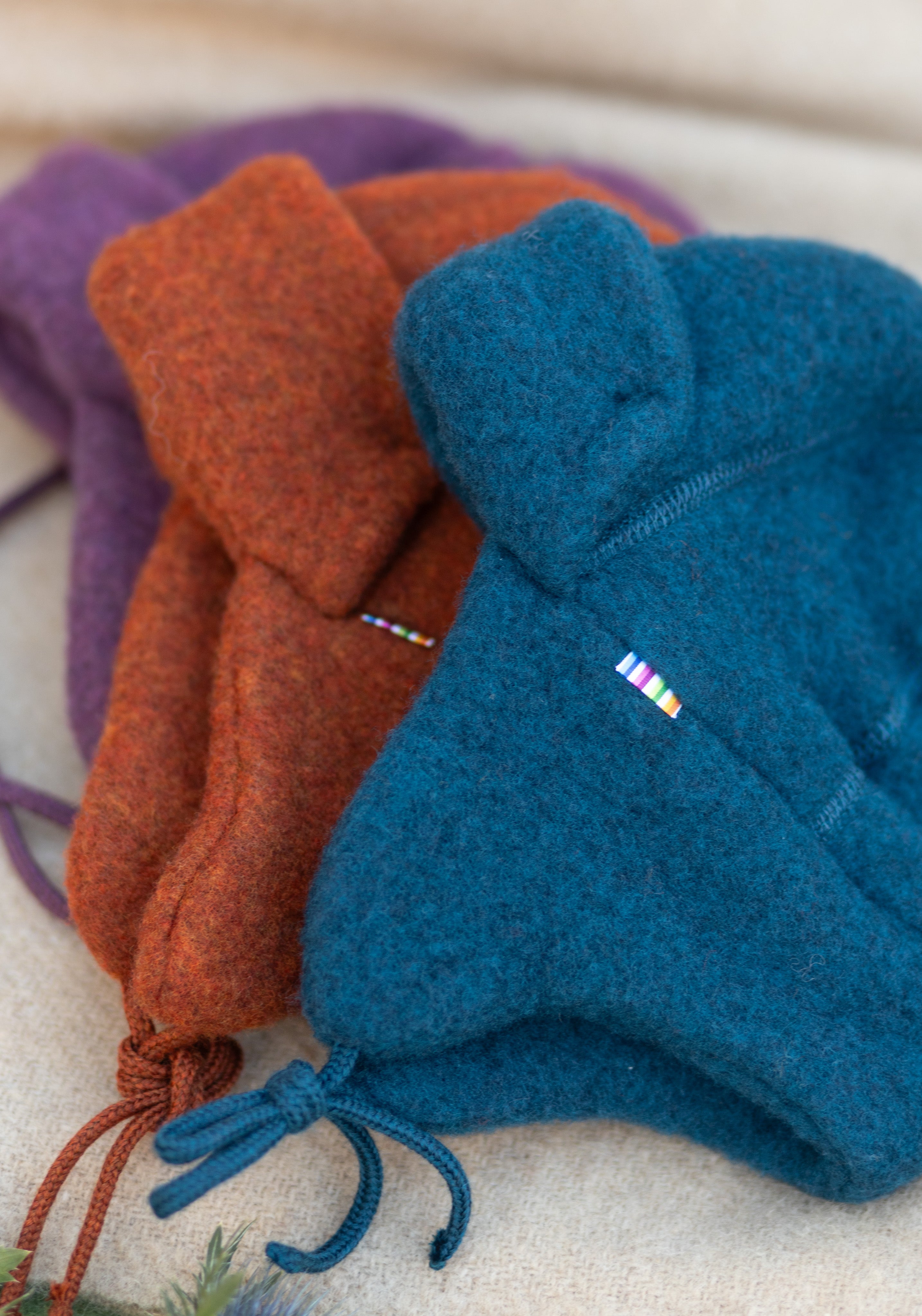 Căciulă tip bonetă cu șnur, dublată, din lână merinos fleece, groasă și foarte călduroasă.