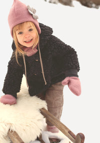 Căciulă pixie din fleece supersoft de lână merinos cu bumbac organic la interior, cu detaliu din lână aplicat.