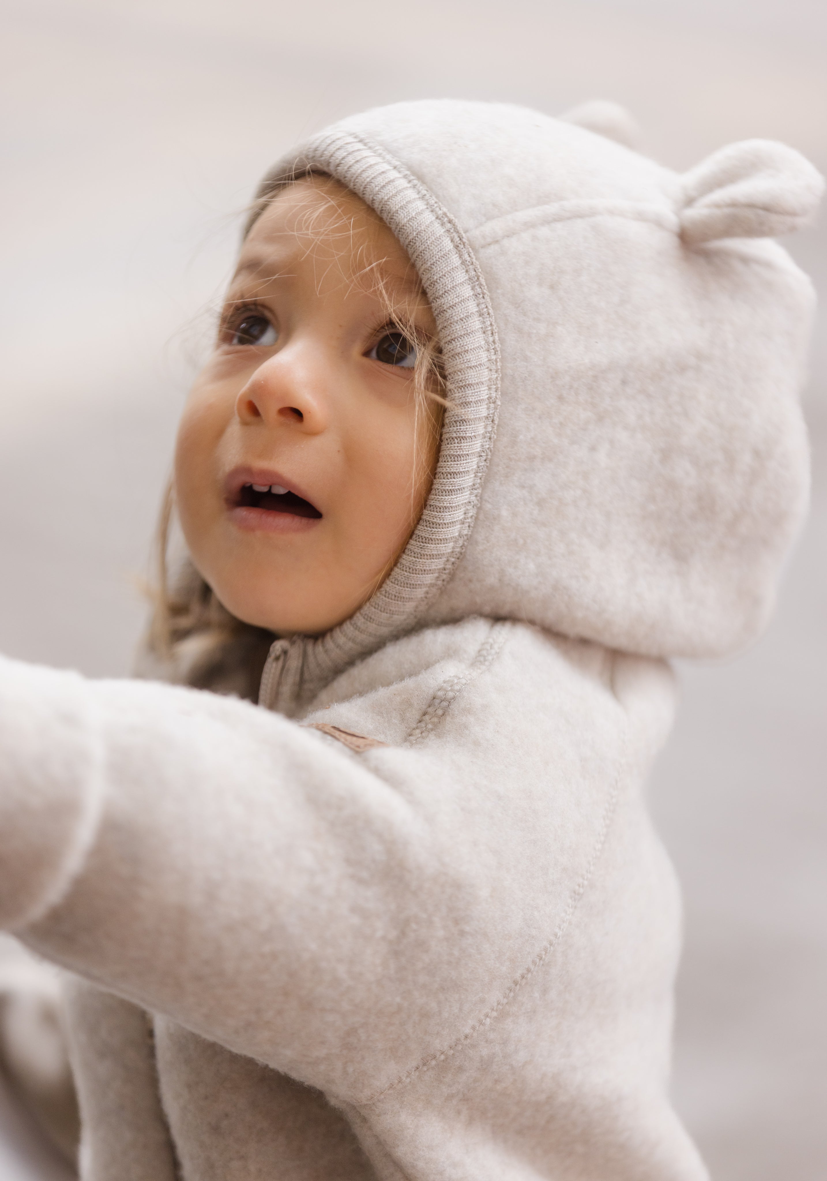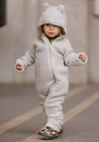Salopetă cu mănuși și botoși fleece din lână merinos - Teddy Bear Melange White