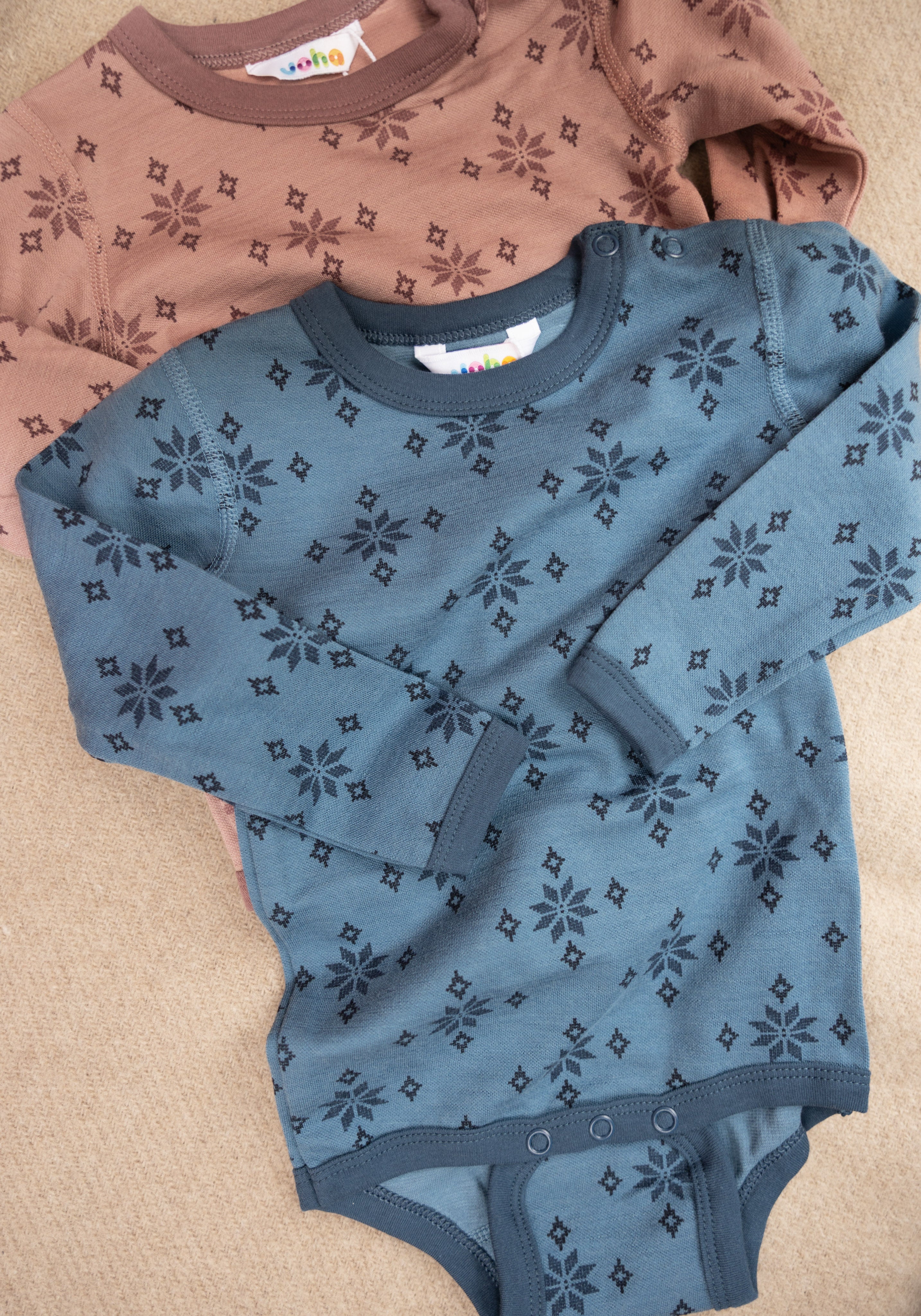 Body cu mânecă lungă cu două straturi, lână merinos fină la exterior și bumbac organic la interior, ideal pentru pielea sensibilă.