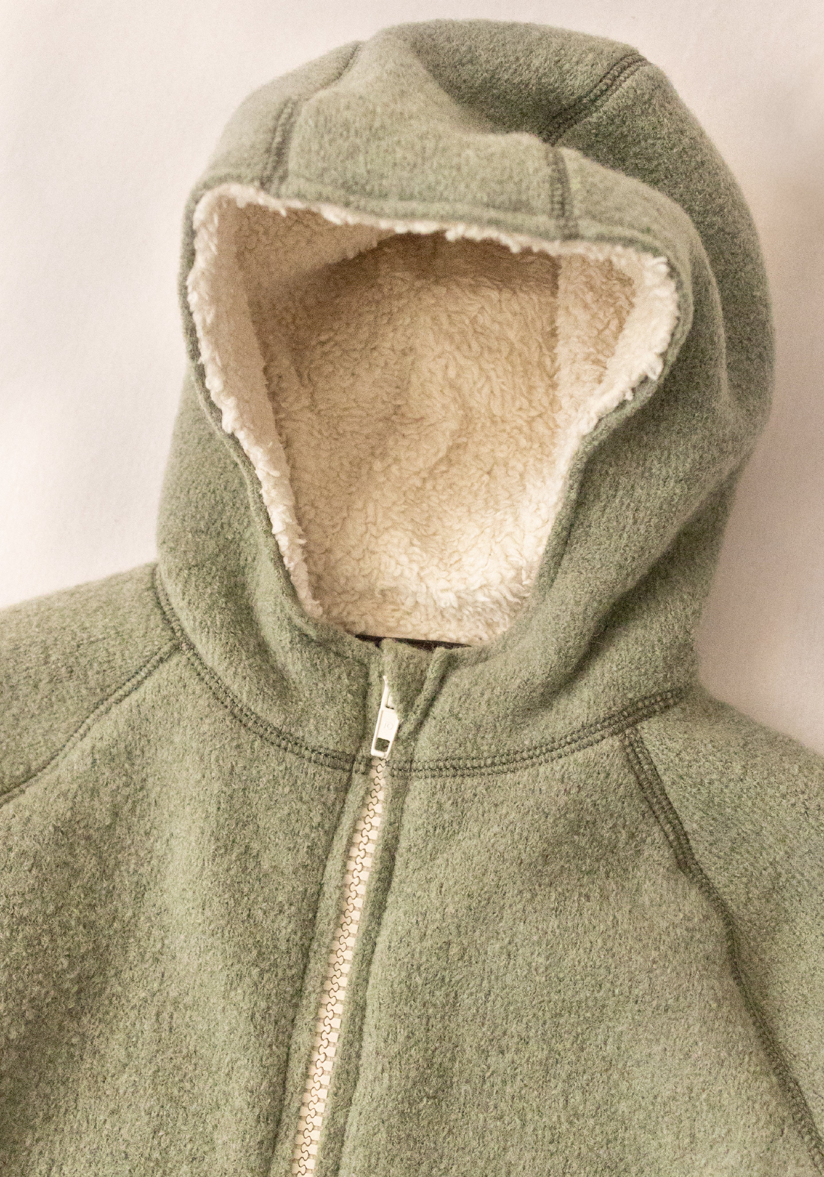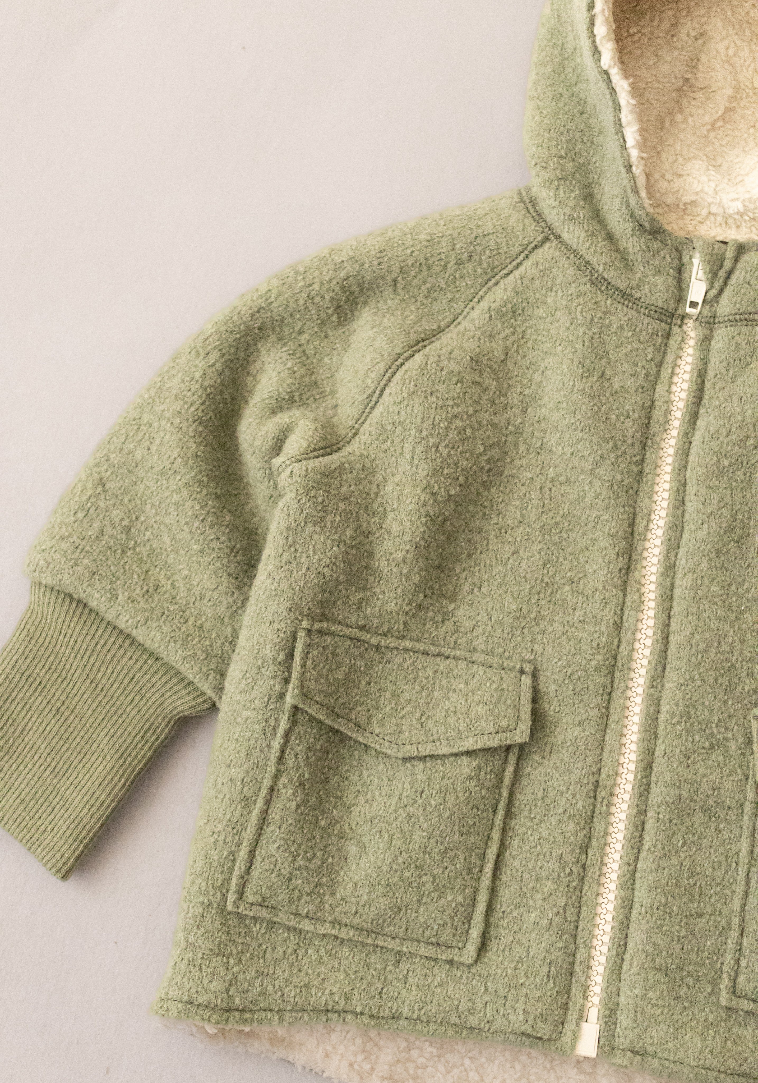 Jachetă din lână fiartă organică, dublată cu material teddy la interior, ușoară și foarte călduroasă.