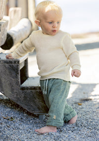 Pantaloni 3/4 răcoroși realizați din noul amestec bumbac și in. Tăietură largă cu o croială foarte joasă. Două buzunare din spate tricotate subliniază aspectul casual. Se pot purta fie cu un scutec sau fără.