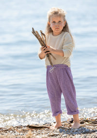 Pantaloni 3/4 răcoroși realizați din noul amestec bumbac și in. Tăietură largă cu o croială foarte joasă. Două buzunare din spate tricotate subliniază aspectul casual. Se pot purta fie cu un scutec sau fără.