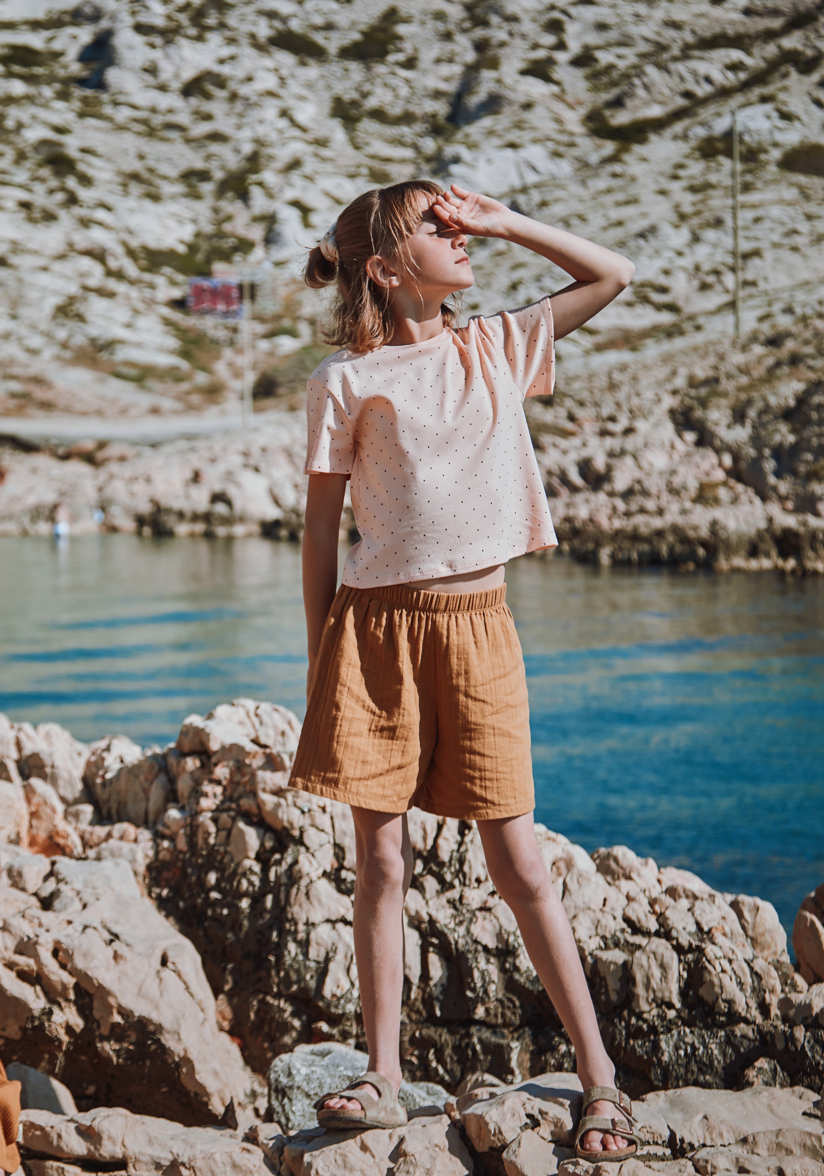 Pantaloni scurți din muselină dublă din bumbac organic, cu design simplu.