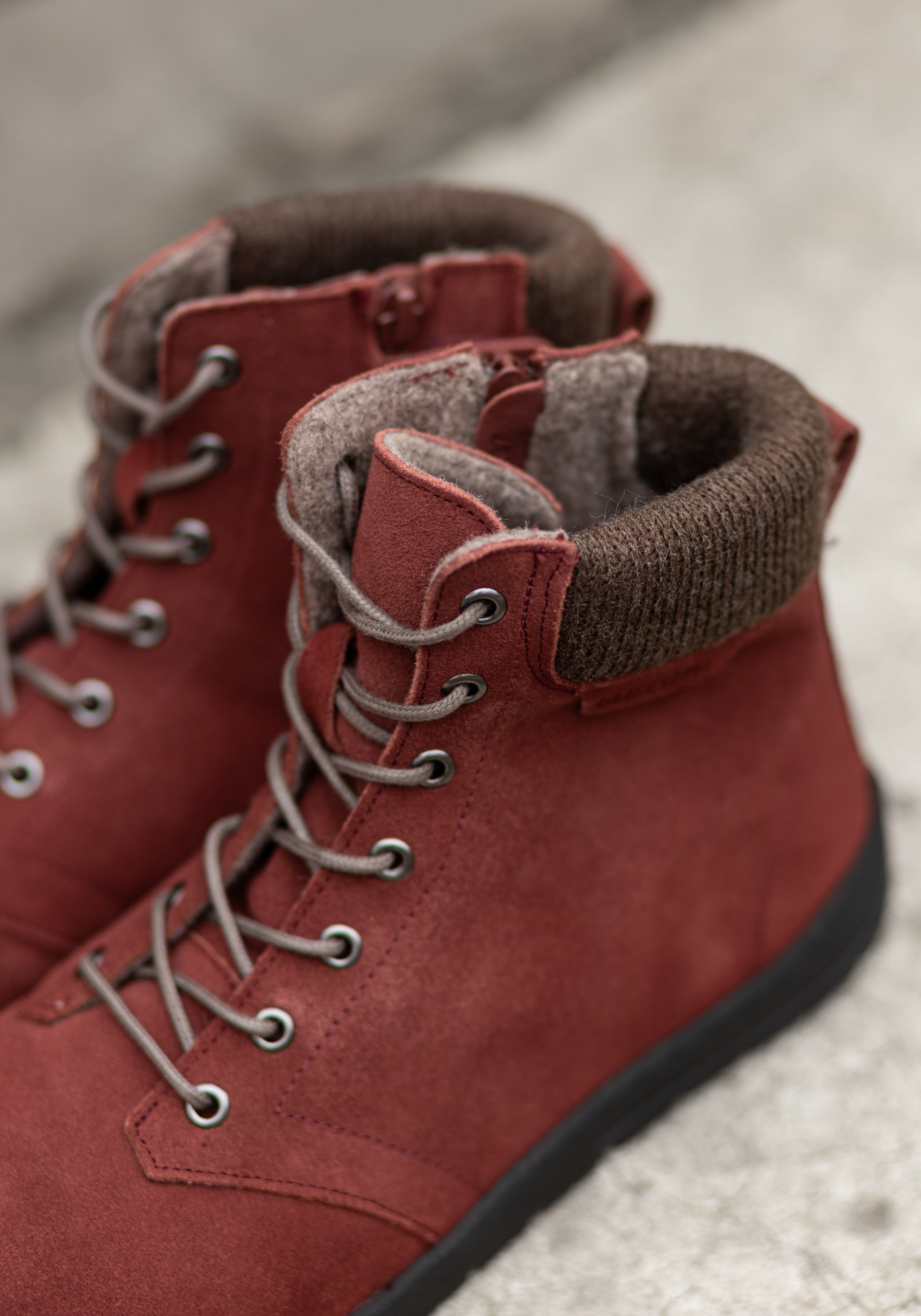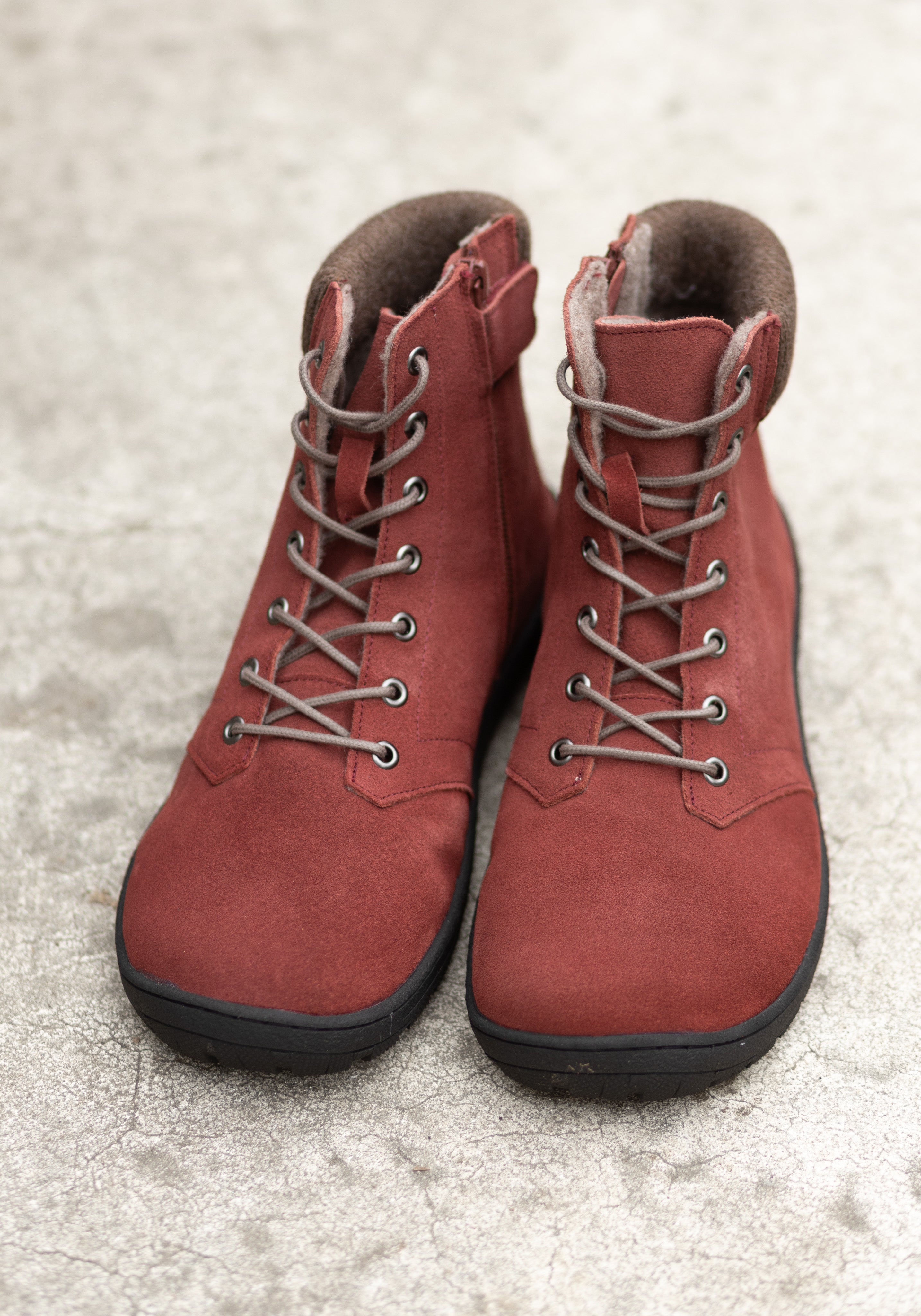 Ghete barefoot din piele întoarsă, căptușite cu lână merinos feltuită. Le recomandăm în special pentru toamnă târzie și iarnă.
