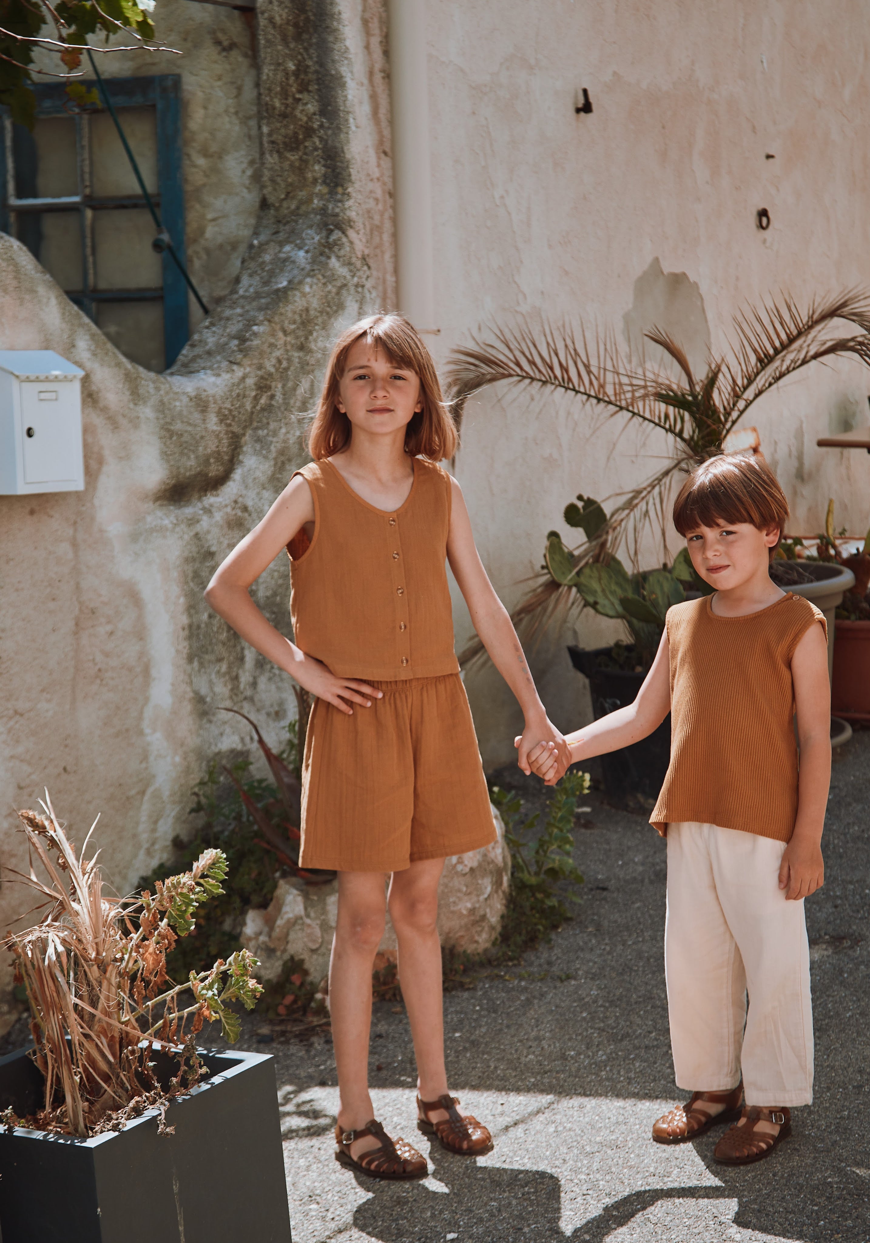 Pantaloni scurți din muselină dublă din bumbac organic, cu design simplu.