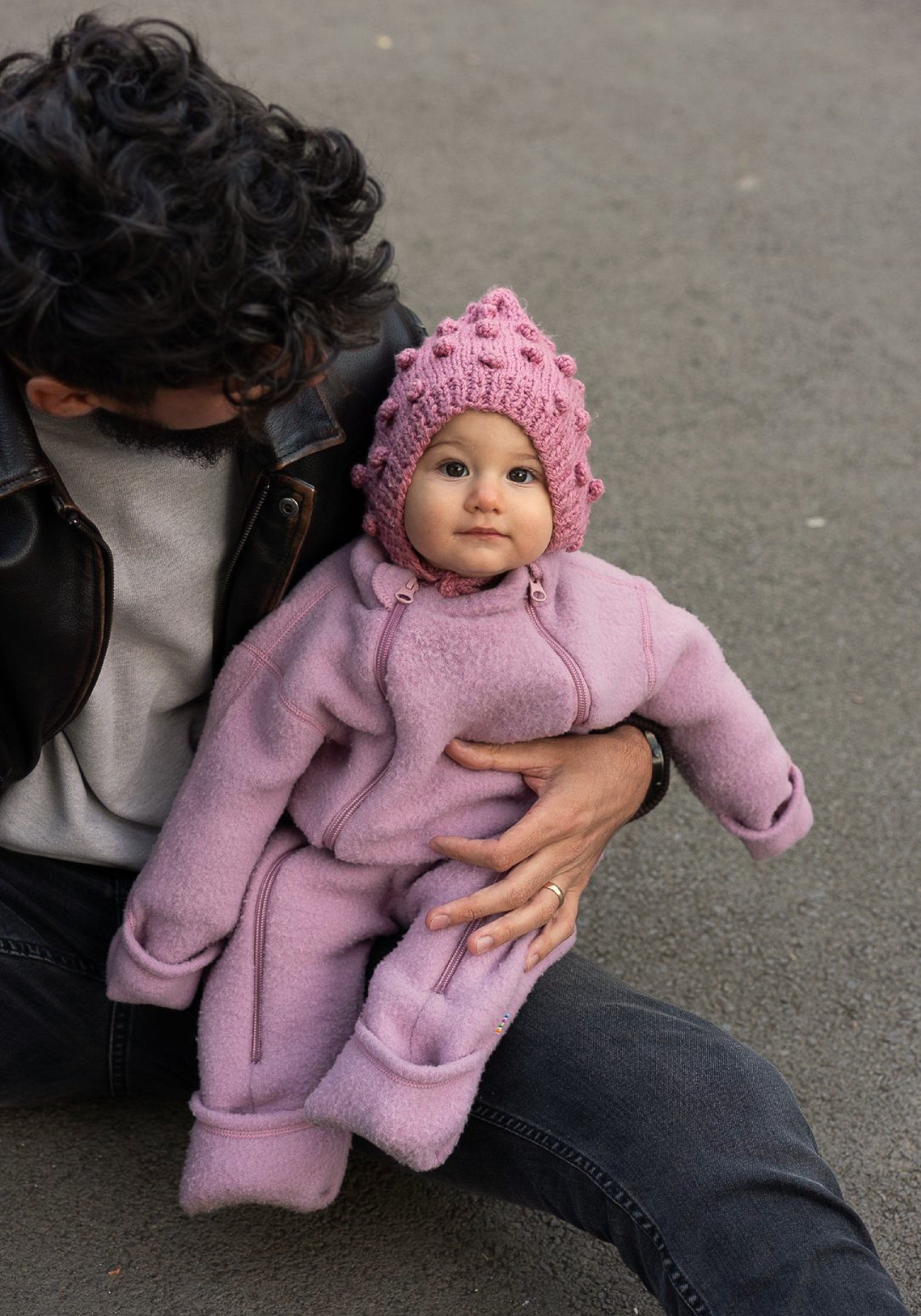 Salopetă cu mănuși și botoși fleece din lână merinos - Old Rose
