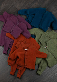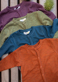 Salopetă întreagă din lână merinos fină, foarte moale şi călduroasă. Ideală atât pentru somnul liniștit de noapte, cât și pentru aventurile pline de joacă din timpul zilei.