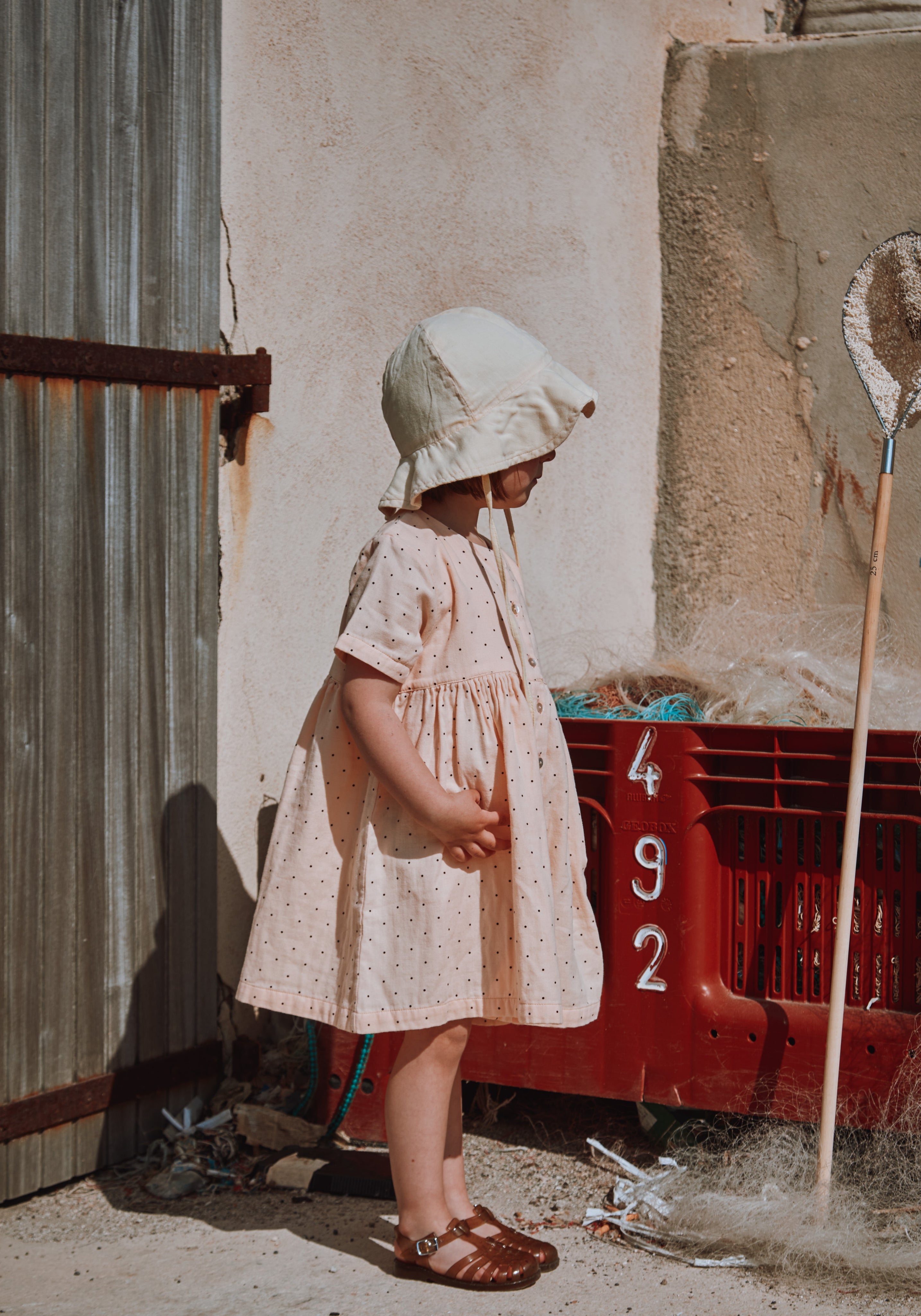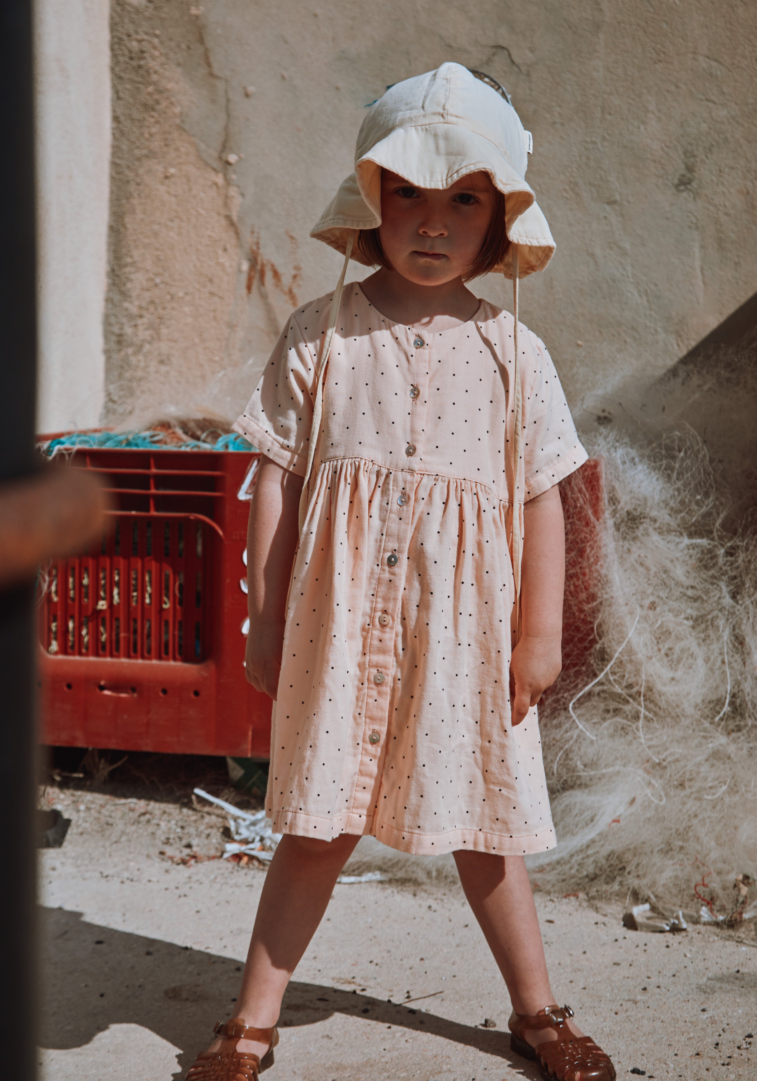 Rochie cu mânecă scurtă și croială ”baby-doll”, din muselină dublă din bumbac organic.