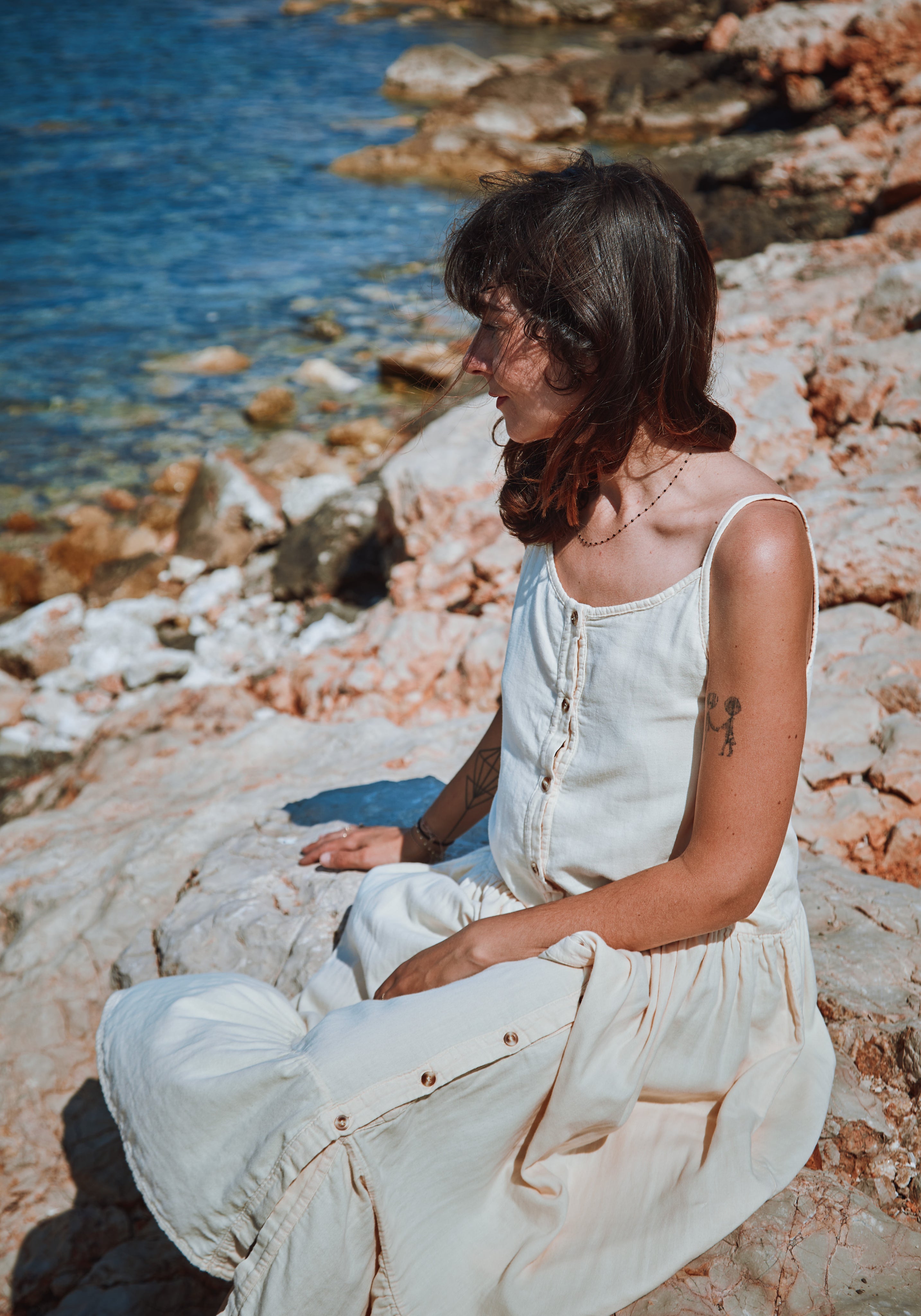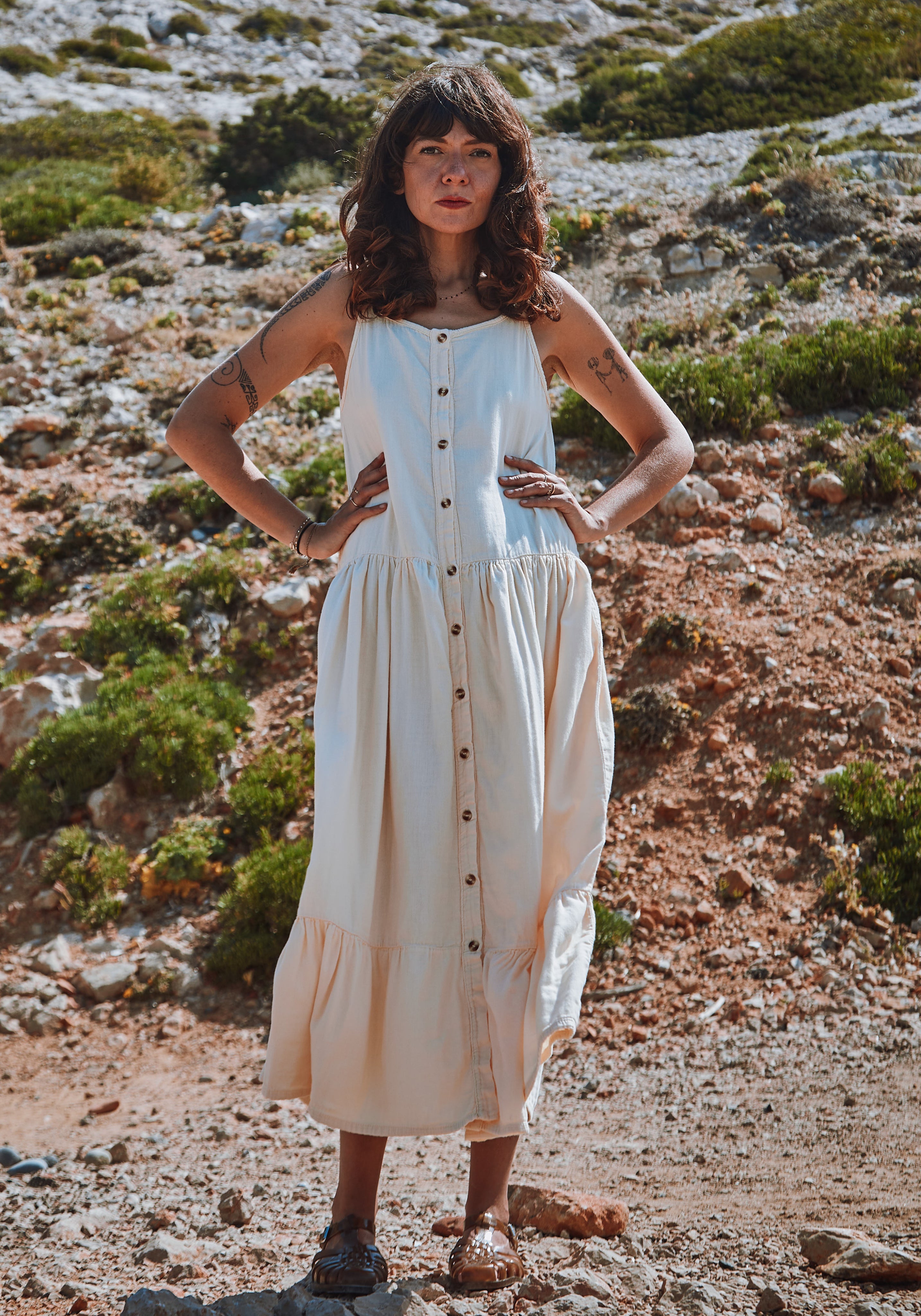 Rochie ușoară cu bretele subțiri, din muselină dublă din bumbac organic.