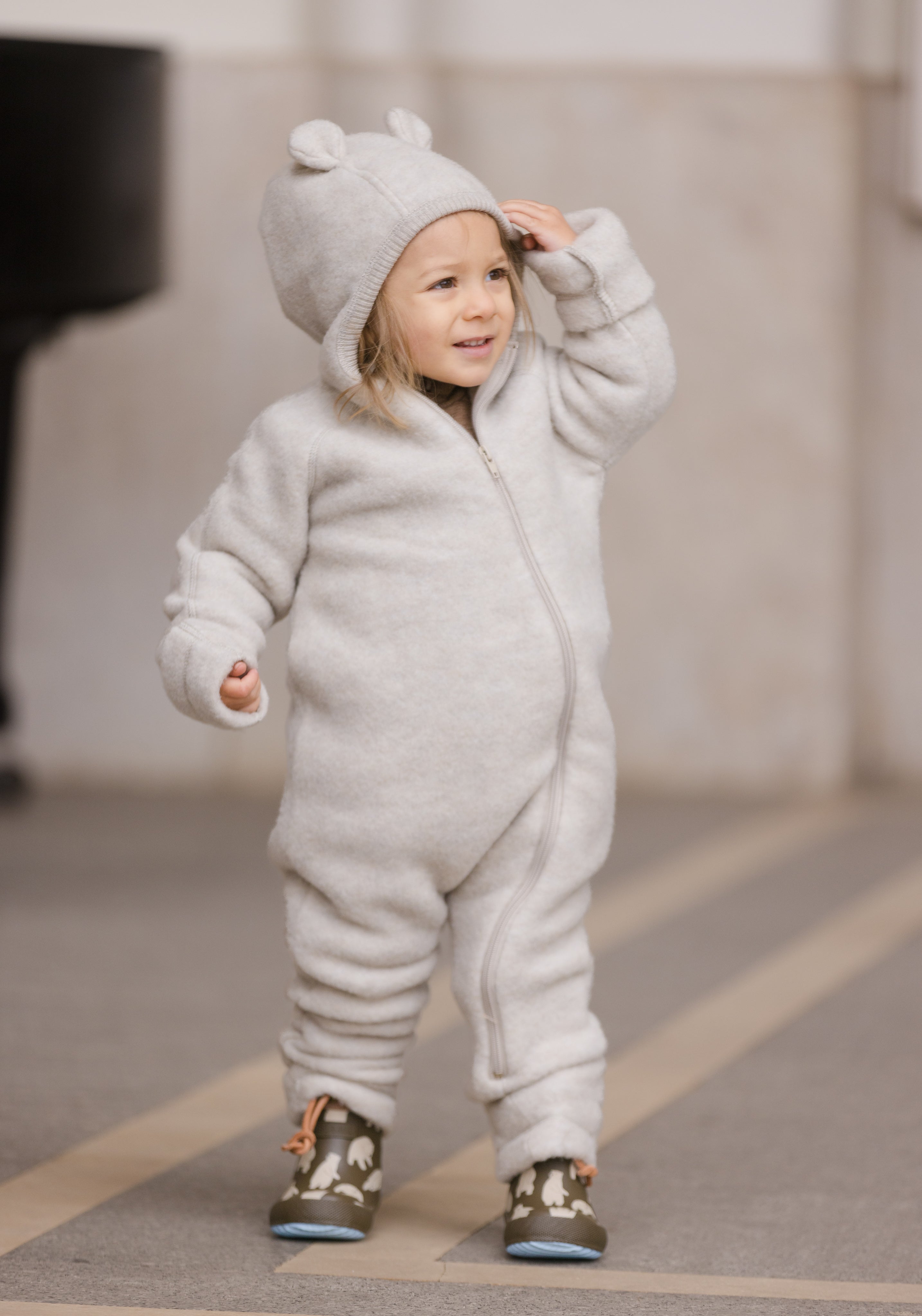 Salopetă cu mănuși și botoși fleece din lână merinos - Teddy Bear Melange White