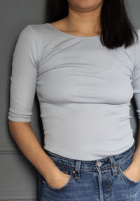 Bluză seamless, cu spatele decoltat și mânecă 3/4 din mătase și bumbac, foarte elastică și comodă, se așază perfect.