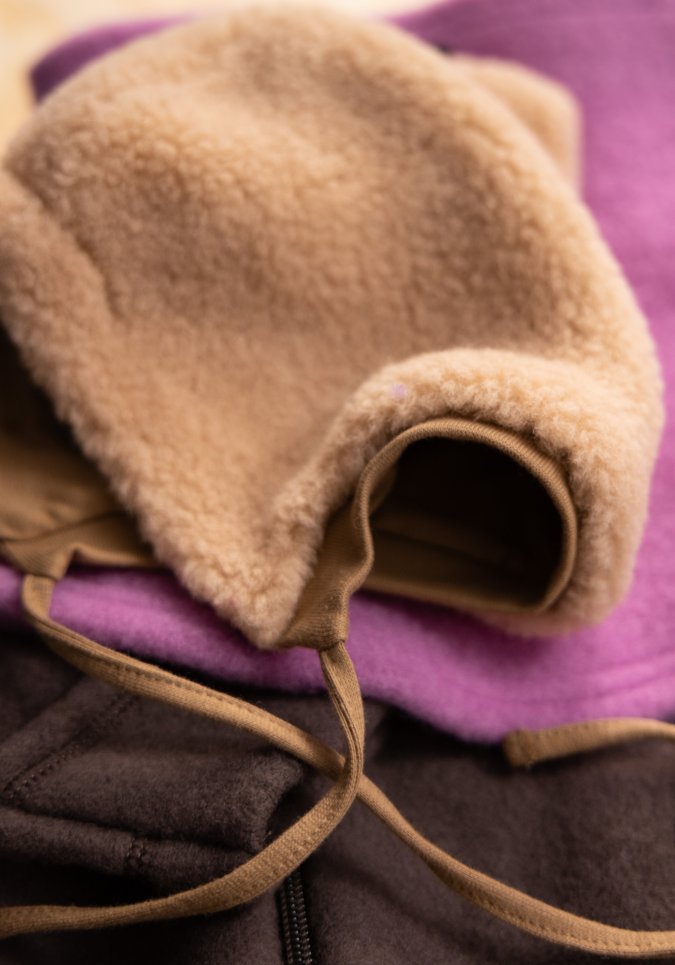 Căciulă pixie plușată din lână organică, dublată cu bumbac organic la interior.