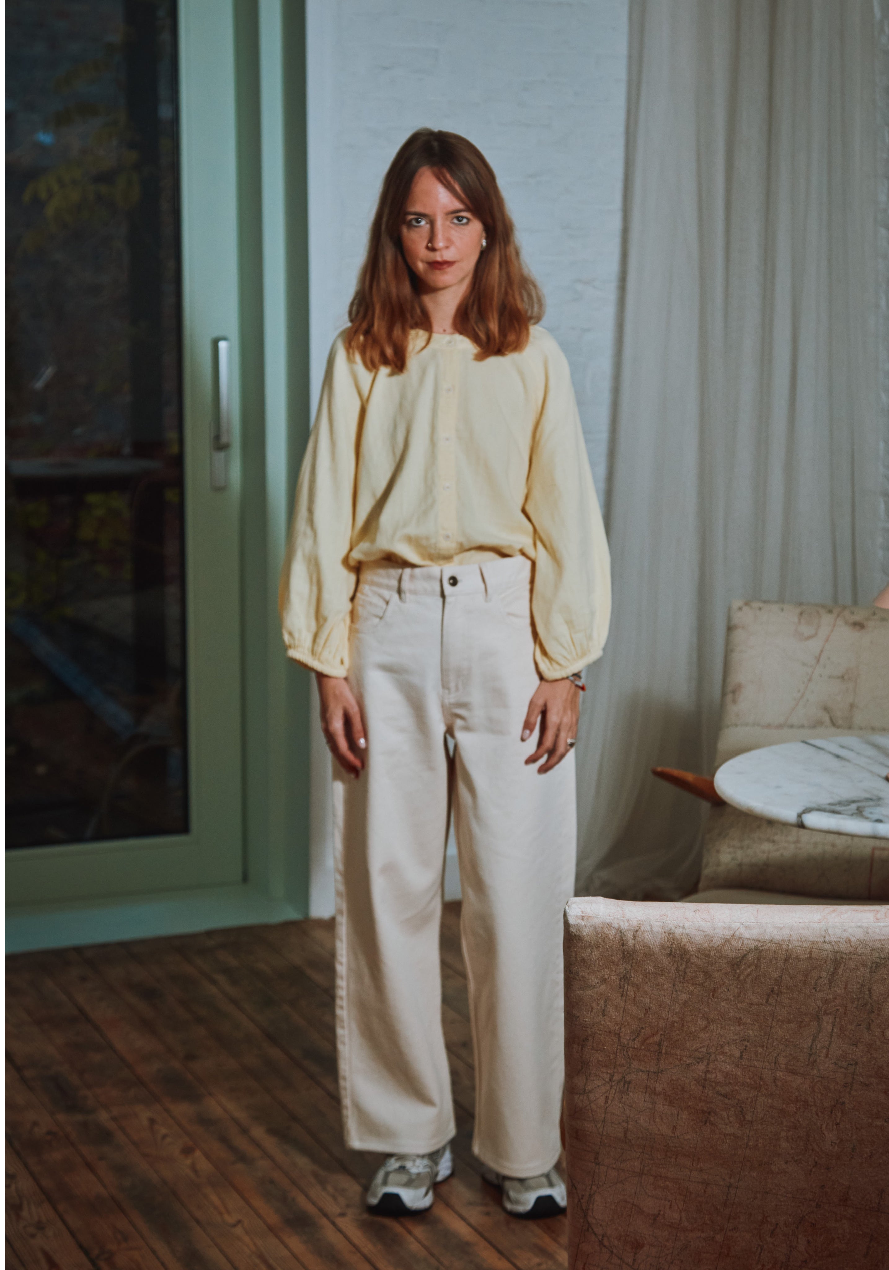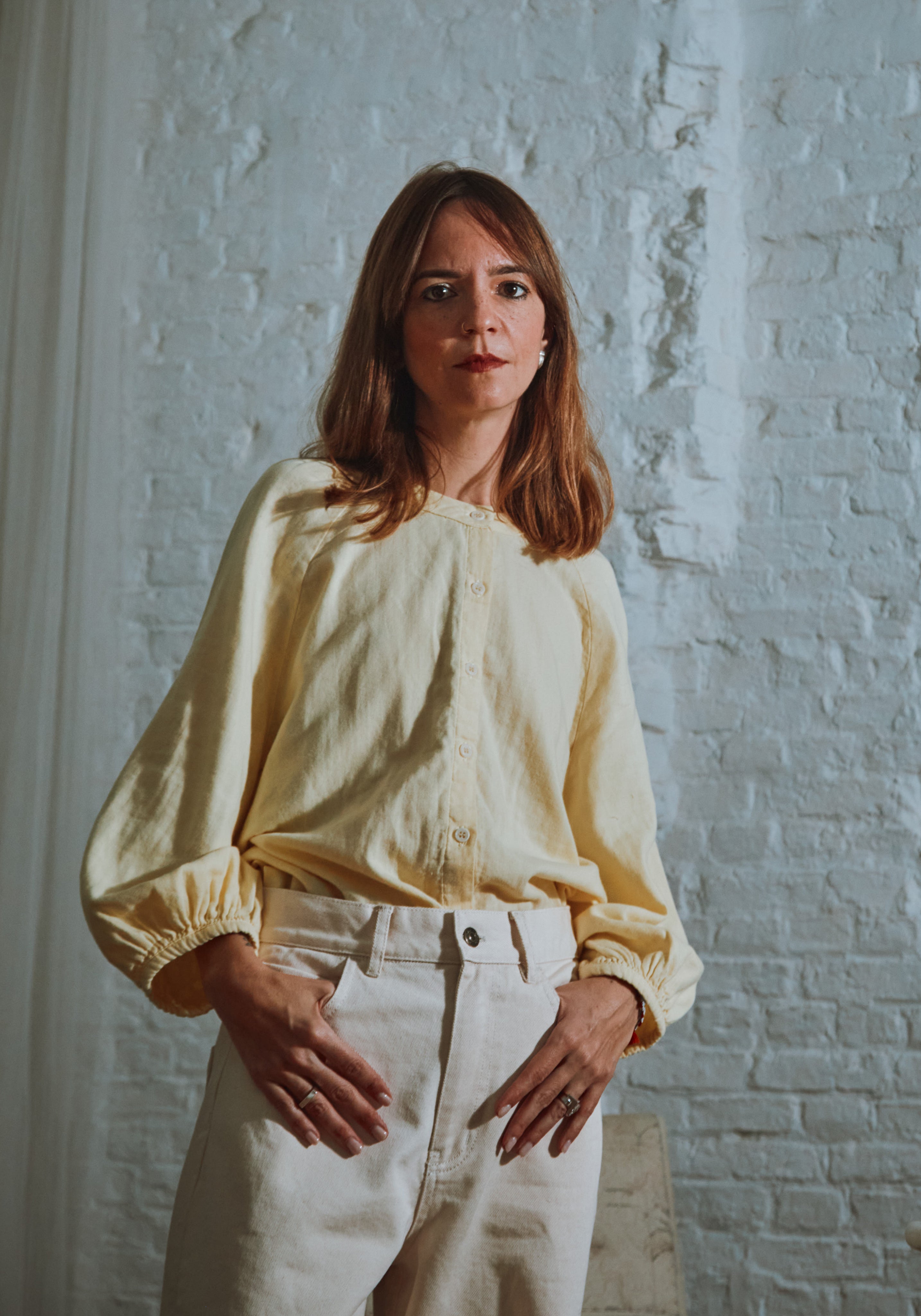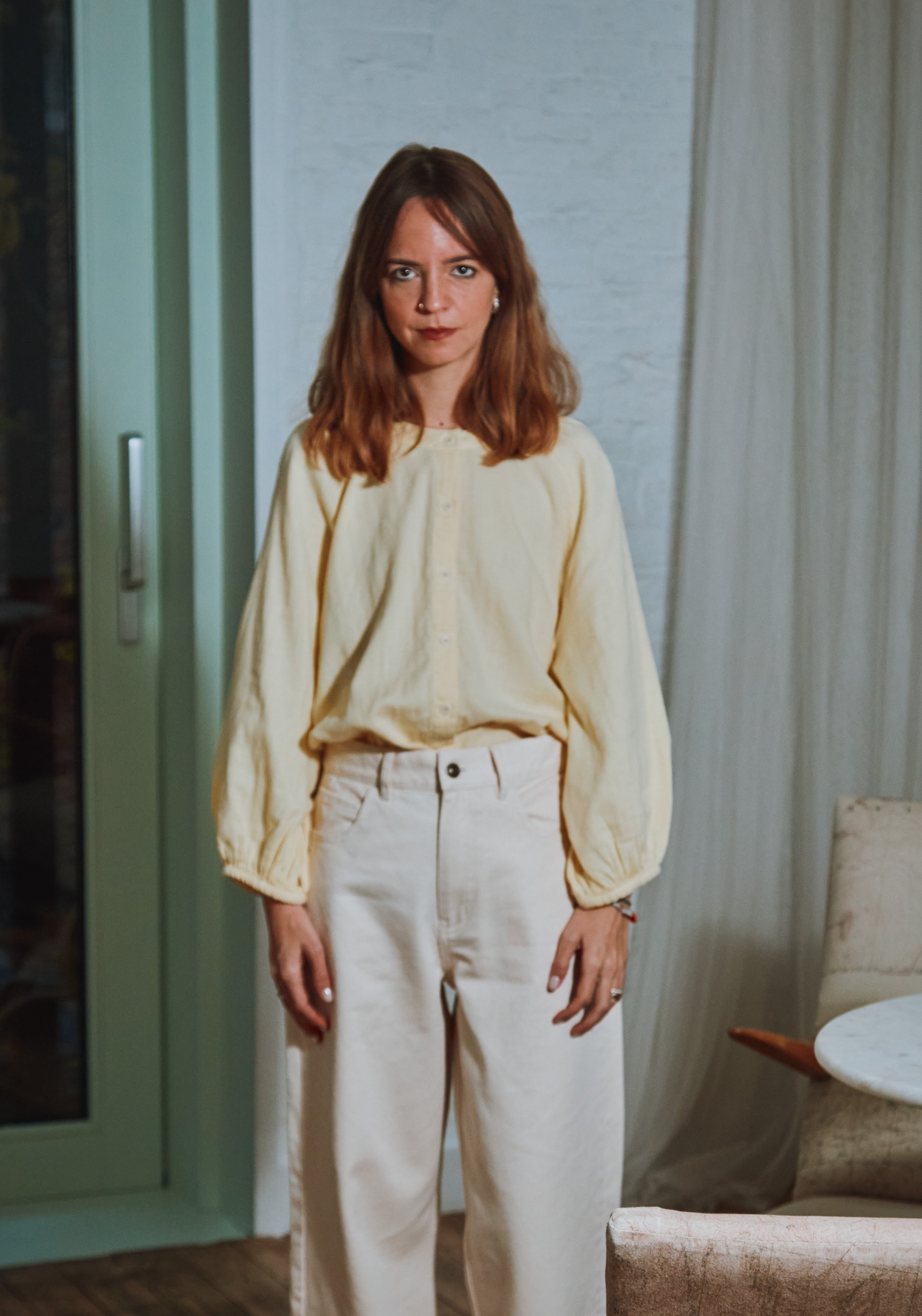 Cămașă cu mânecă 3/4 din muselină dublă din bumbac organic, elegantă, cu un design minimalist.