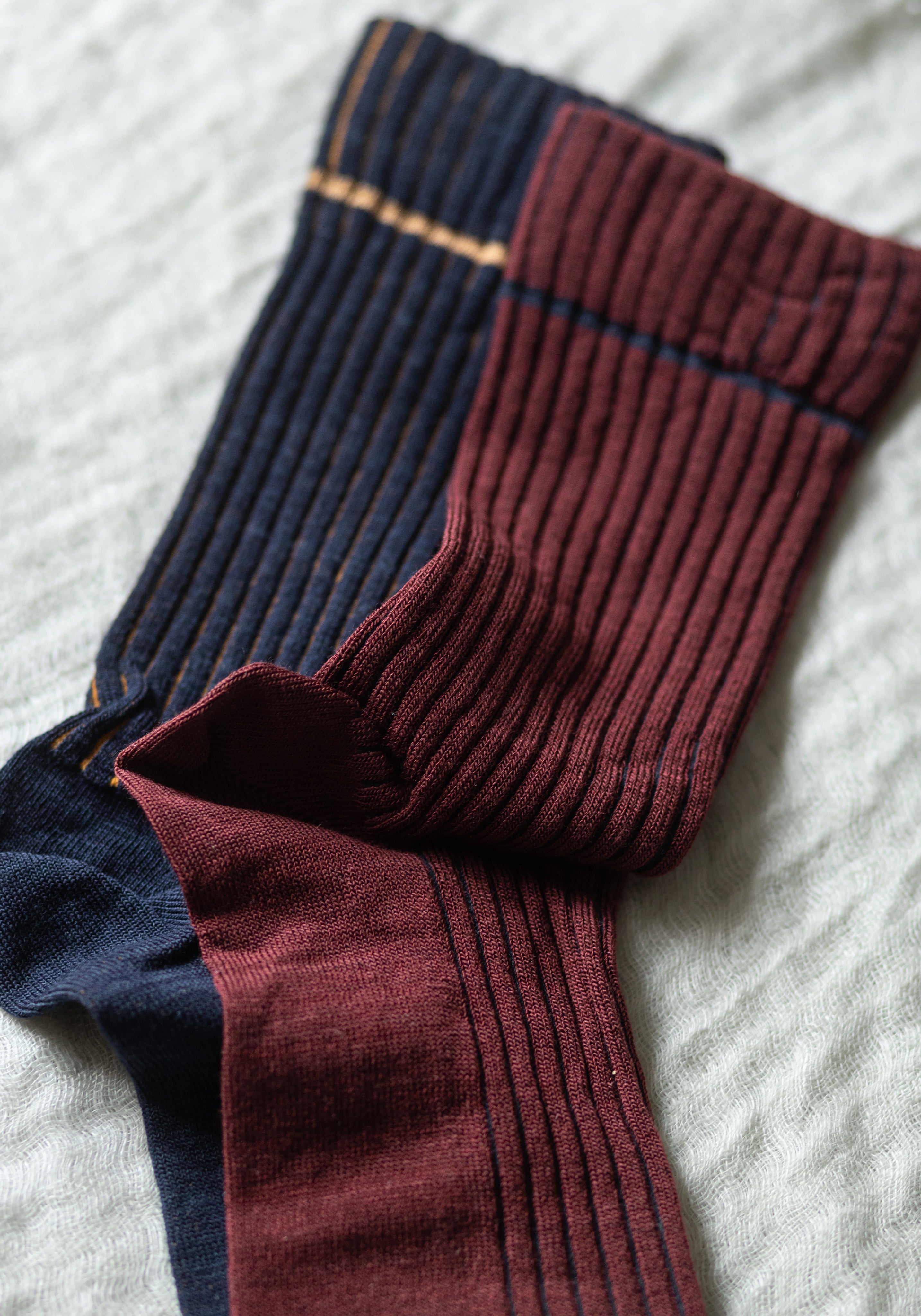 Șosete groase din fir mixt de lână merinos și bumbac, în culori contrastante.